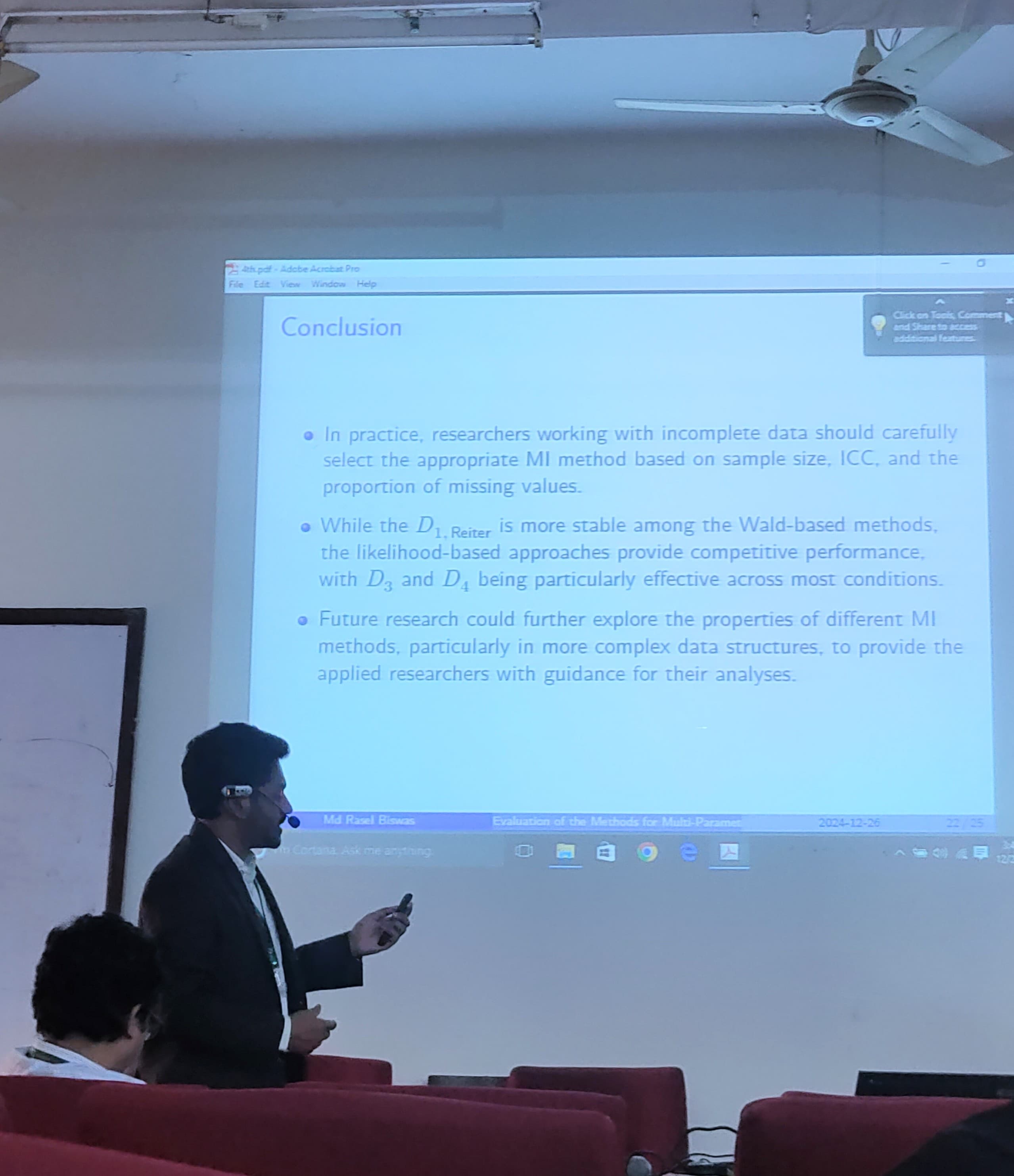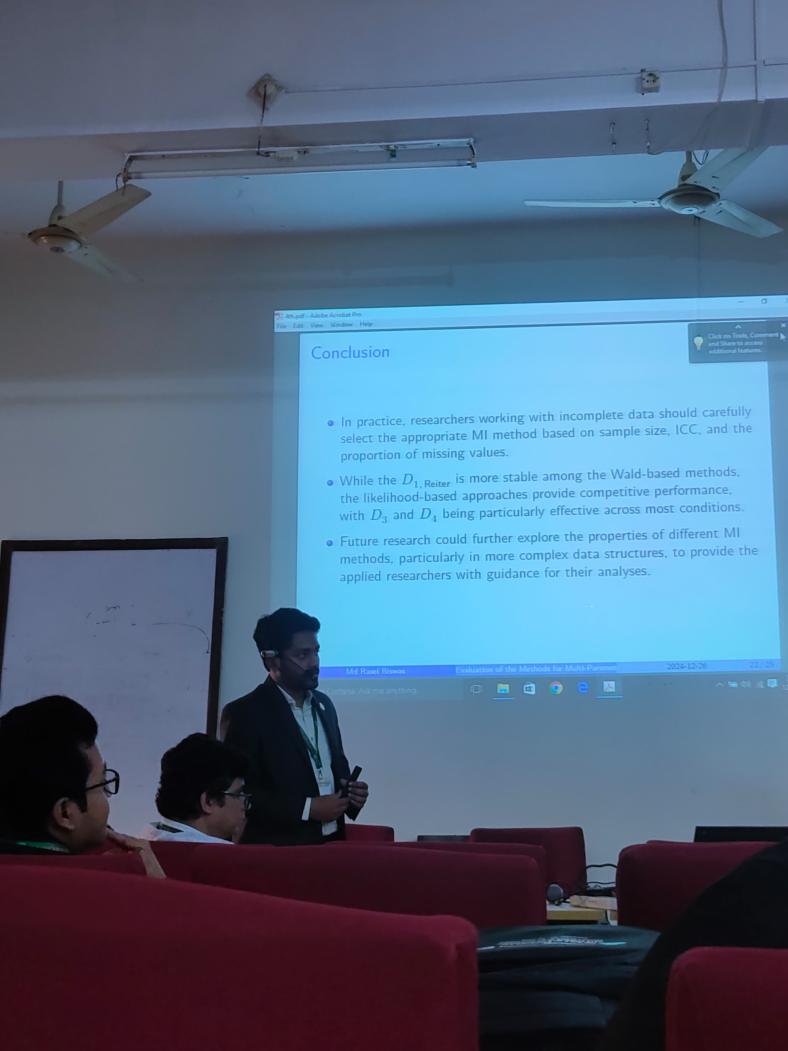 I recently attended a conference organized by the Department of Statistics at the University of Rajshahi, where I delivered an invited talk on “Evaluation of the Methods for Multi-Parameter Hypothesis Testing in Multiple Imputation: A Focus on Correlated Responses.” It was a rewarding experience, filled with insightful discussions and meaningful connections with fellow statisticians.